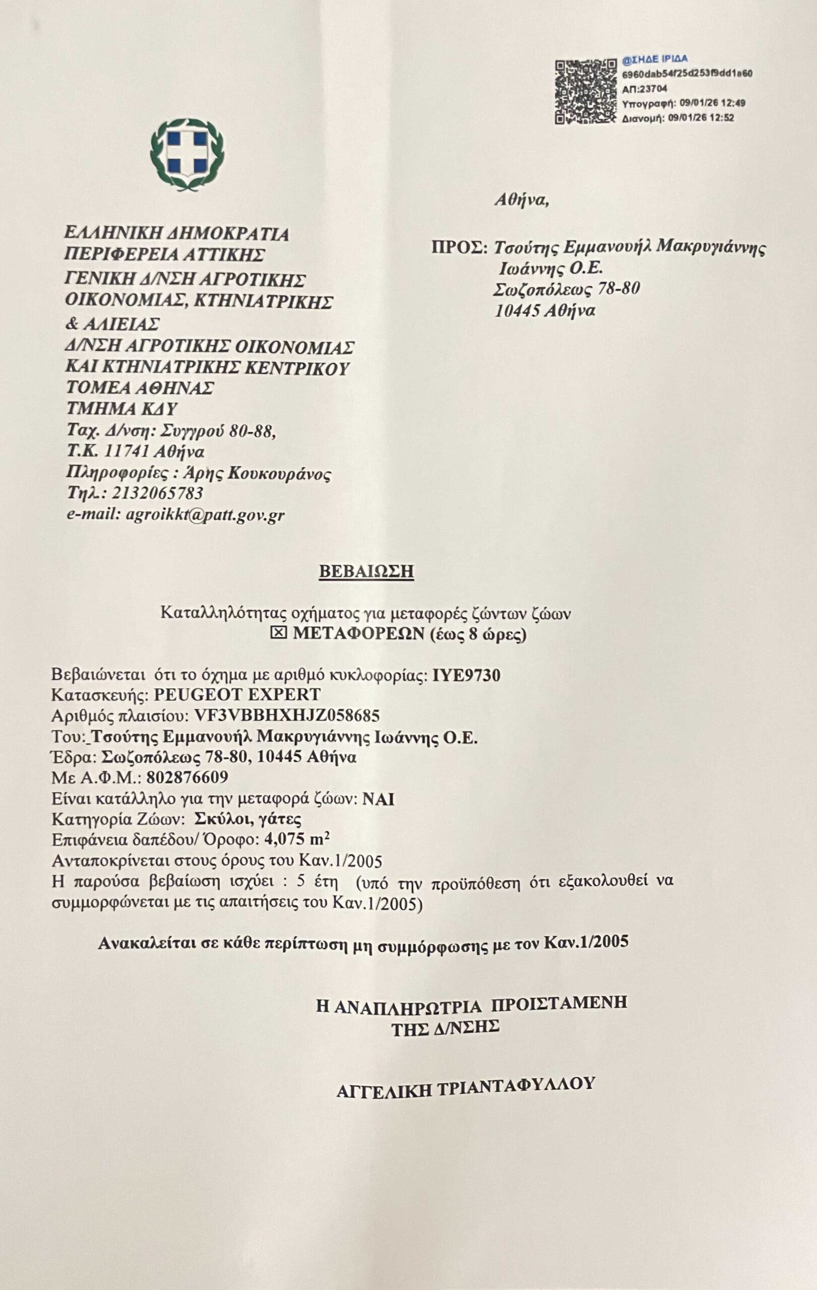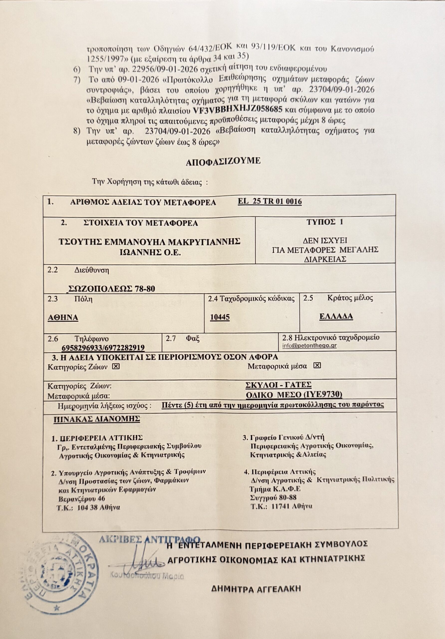 Η Pet On The Go διαθέτει επίσημη άδεια μεταφοράς ζώων από την Κτηνιατρική Υπηρεσία. Τηρούμε όλα τα πρωτόκολλα υγιεινής και καθαριότητας, ώστε κάθε διαδρομή να είναι ασφαλής και αξιόπιστη.